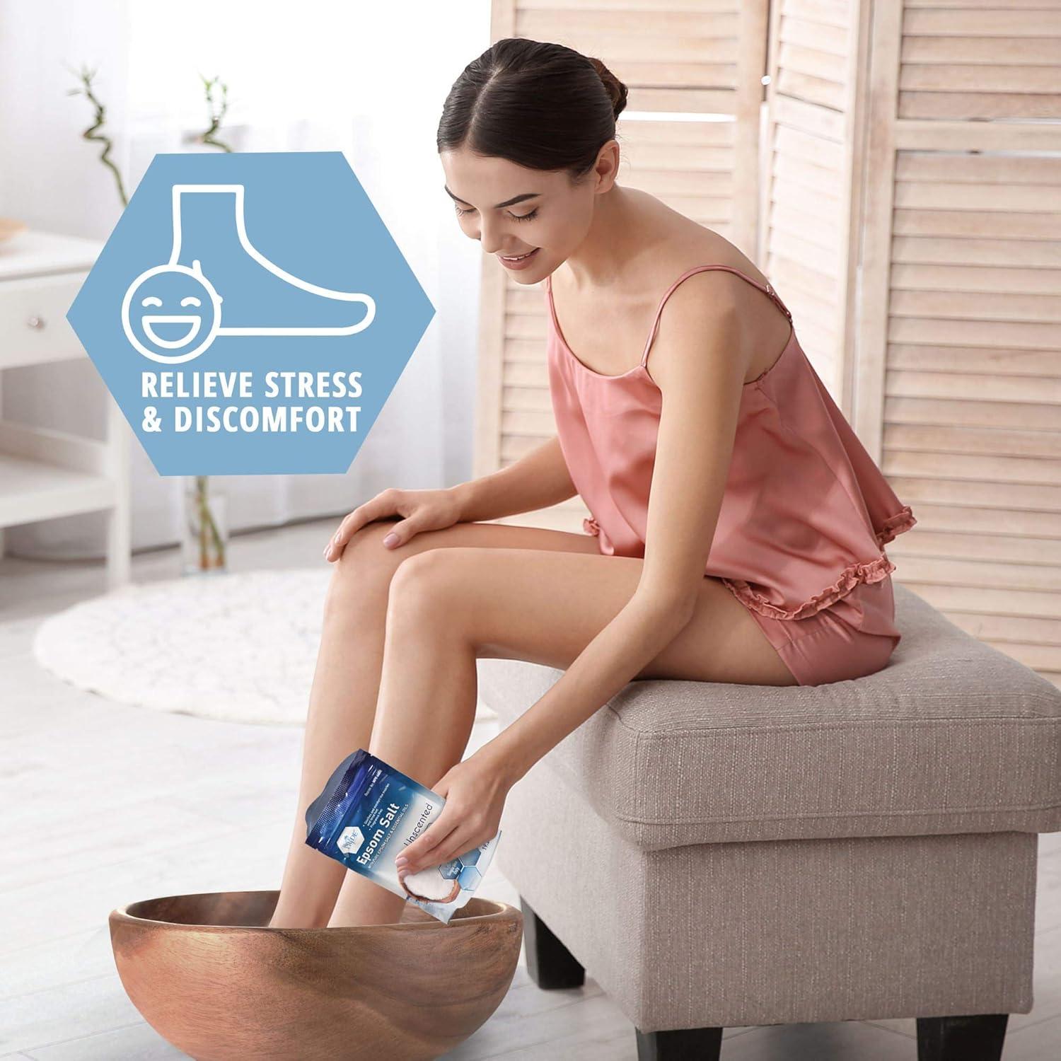 STRESS REDUCTION: Melt away stress with our pure epsom salt bath, promoting better sleep and a sense of calm. In today's fast-paced world, just 20 minutes of soaking in our epson salts for soaking can significantly reduce stress.